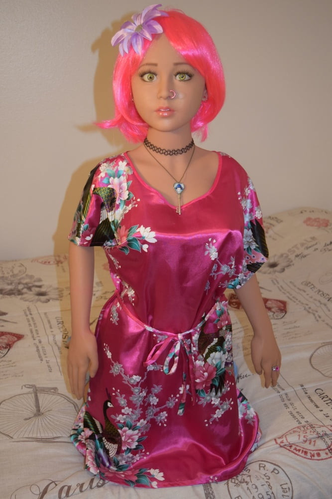 She weighs 54# and is 140cm tall. She is made of TPE, with a metal skeleton. After a corn starch massage she feels amazing and I can barely keep my hands off her to snap some shots. Especially after I get her all dressed up!